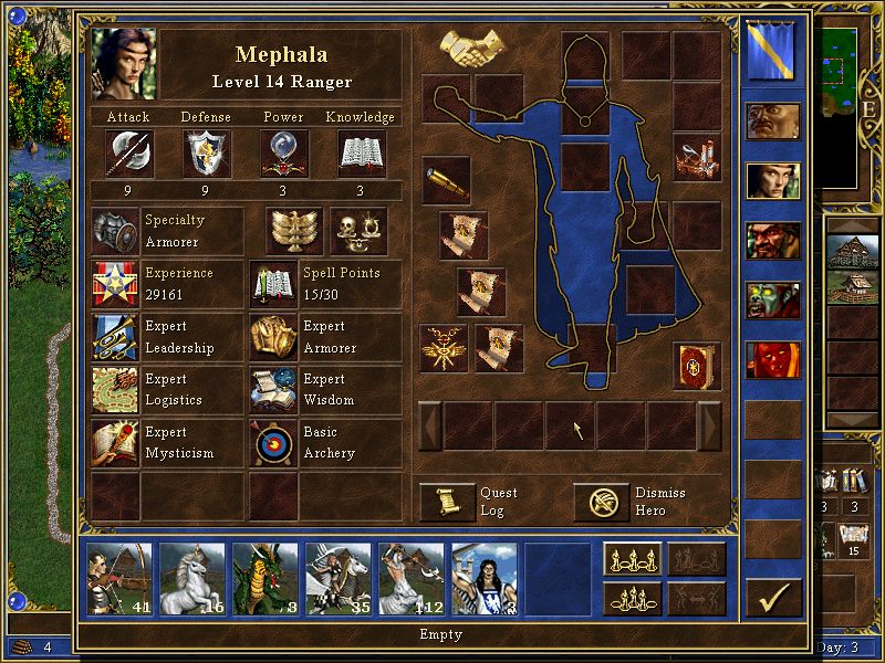 Příšerná mapa, že jsme začínali bez Fortu, ještě beru, ale pak jsem byl uvězněn na ploše o velikosti cca 1.5 obrazovky a 3 týdny jsem si mohl akorát honit, protože vchody hlídaly buď 1) horda magma elemental 2) houf gorgon 3) houf wyvern. Třetí týden s 1 drakem a 6 unicornama jsem probil gorgony, abych se dozvědel, že na druhém konci čeká houf enchanterů. Ok, nedá se nic dělat, Kačer si mezitím udělal skoro 2x lepšího hera, takže vyndám elfy a jdu na ně, bylo jich myslím 40. První kolo waitnu, ale oni si hodi mass haste, ignorujou kentaury a hned na dálku zabijou skoro celýho draka. Druhé kolo začínají a rozjebou skoro všechny unicorny... Pak už jsem to rovnou vzdal.