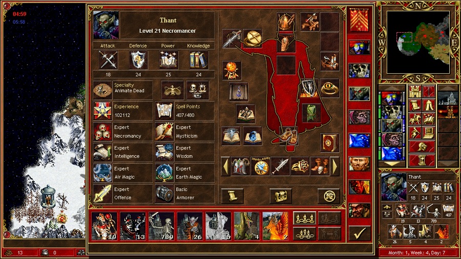 nabidlo ihned skill inteligence cestou pomale necro naslo red tower takze mrte pohzb diky fenixovi a dokonale polozena studna skoro na okraji treasure zony...2 utopie jedna 2.ha nej, druha uplne nejsilnejsi neni pro thanta s mrte manou 3ti a 4ty tyden zadny problem... sec. hrad peklo takze zase hafo koster z dabliku...level 15 konec druheho tydne...souperi nepomohly ani 3 stejne hradz a exteraky ... druha utopie hodila knizky, takze imploze za 2.5 ihned poresila 110 elfu...