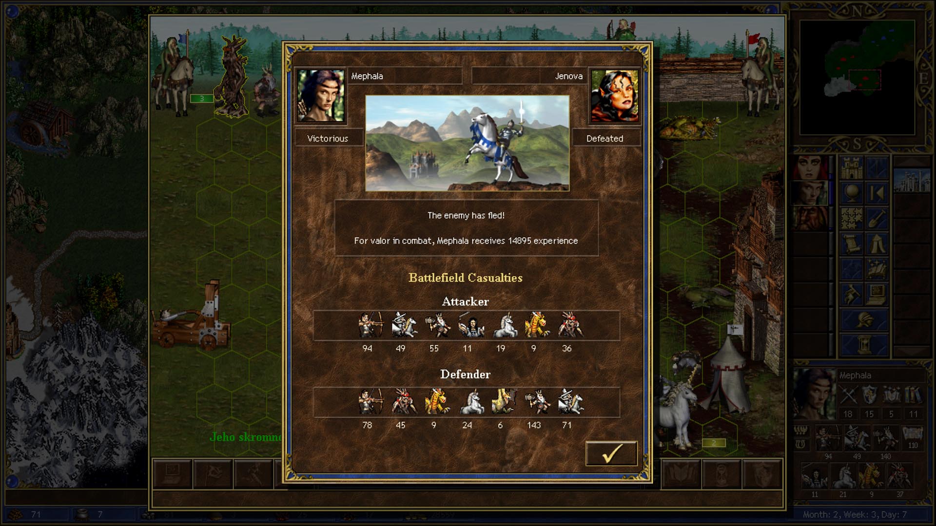 V půlce boje už jsem chtěl pomalu vypínat, trpaslíci a silní enti se rochnili v příkopech bašty, ale ukázalo se, že mass weaken je opravdu silné kouzlo a moje jednotky dělali větší škody, než ty Alexovi. Alex sice ke konci vedl na počty jednotek, ale nakonec mu to nestačilo. Poprvé v životě jsem použil v boji kouzlo teleport a přeportil si oddíly jednorožců za hradby, které pak rozdávali slušné škody a nějaký ten blind. K tomu pár morálek a souboj se najednou otočil v můj prospěch. Alex se to snažil posledními oddíly ještě nějak uhrát a utíkat, aby mě postříleli věžky, ale všechno nakonec ukončili přeživší trpaslíci opět připortění k prchajícím entům od Alexe.