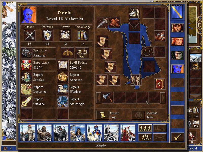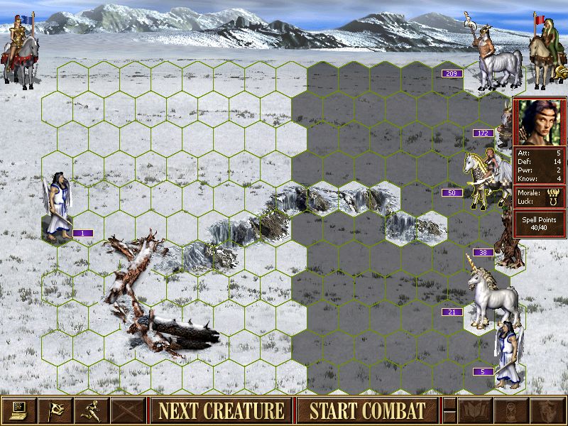 dobrá a těžká hra, od startu sem od neutrálů pěkně dostával na prdel, gremlini toho moc nevydrží, ale hold sem je obětoval úspěchu, největší oběť podstoupili v konzervatoři, kde všech 160 zařvalo, protože sem najel na 200 gryfů :D sem čekal mín, nebýt pc blbý, tak mě dali :) potom sem našel svitek dimensky a když sem za horama v bažině viděl meč práva, tak hurá na něj, hlídalo ho 150 upg. pegasů, tam sem obětoval další gremliny :D no a poblíž byl za packem upg. behemotů kartáč, tak sem na ně najel a modlil se, aby neměli morálku, potom sem viděl alexe, že se chystá jet na mě, tak sem dohopsal do kobky, kde sem si zdvojil manu a čekal, že mě napadne v hradě, nenapadnul, tak sem díky jeho veliké početní přesile nasadil akci kulový blesk a ubleskoval sem ho k smrti :D viz obrázek