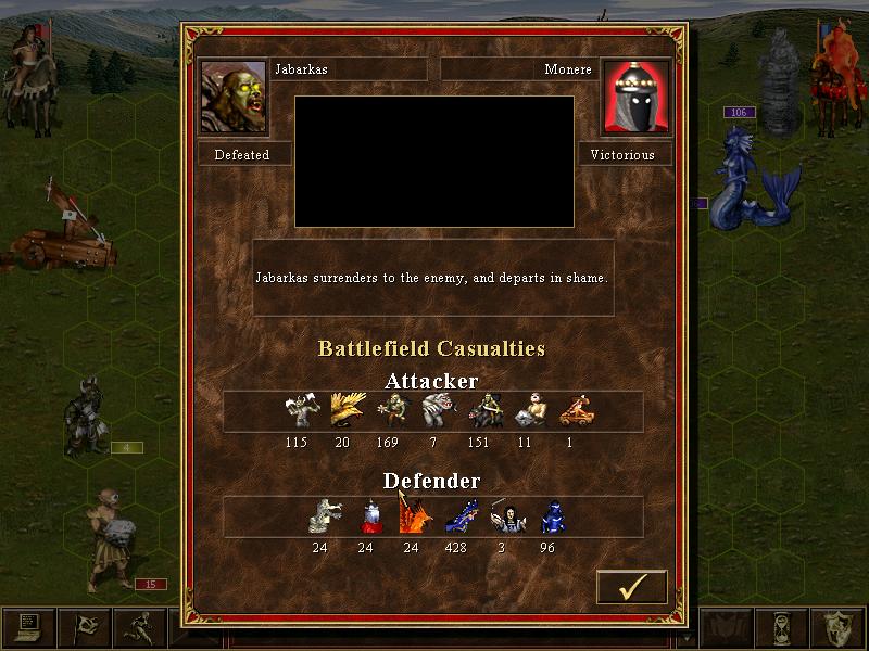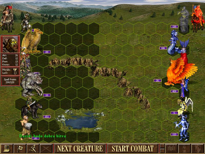 jo pekna hra ale chybelomi nejaky kouzlo jako treba town portal ja se moc nemohl vidat do sveta protoze souper mel town portal a ja bzch byl o 3,4pryc a uy by od nekud prilitnul a prisel bych o hrad a v prvni bitve mi nepralo stesti a moralka.To bylo hodne videt ze souper s 15 cyclopama dostal stesti ap k moralku a ja nic.mel jsem Expert luck a prvnich pet kol jsem ze sedmi jednotkama dostal jednou moralku z vilama.dik zah hru.a taky jsem si mel vilepsit ptaky.byla to hodne dobra hra.