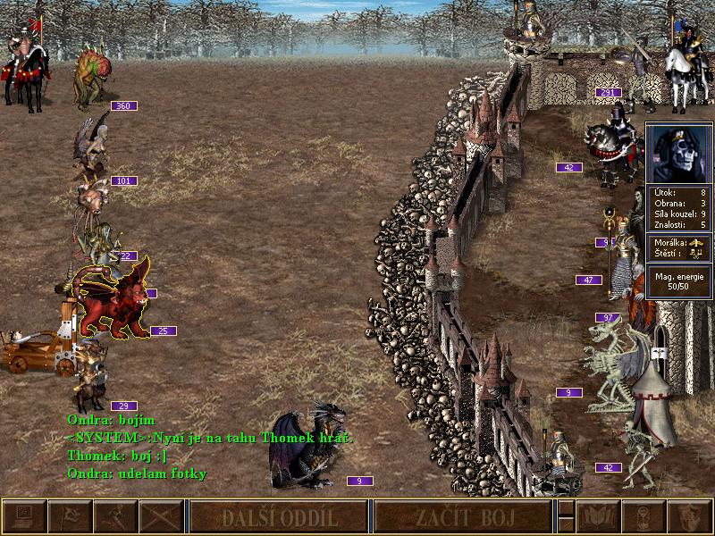 ufff tahle hra byla dost zajímavá kamení jsem našel až někdy v půlce 2 populace a ještě bylo za hradem takže jsem to musel celý object jináč měl sem exterák na jízu a na upíry a na kosti fajnová hra já jsem se bál že prohraju pač sem viděl upg řerný draky a řikal jsem si tak to je konec soupeř mě napadl když jsem byl v hradě tam sme bojovali mazec bitva pak se soupeř vzdal a já mu mohl jít na hrad měl sem lýtání a viděl jsem jeho hrad a řikal jsem si mám mu vlýst do hradu ale je to risk co když tam bude mýt dobrou army tak sem to rrisknul a vyplatilo se jinak hra dobrá díkky