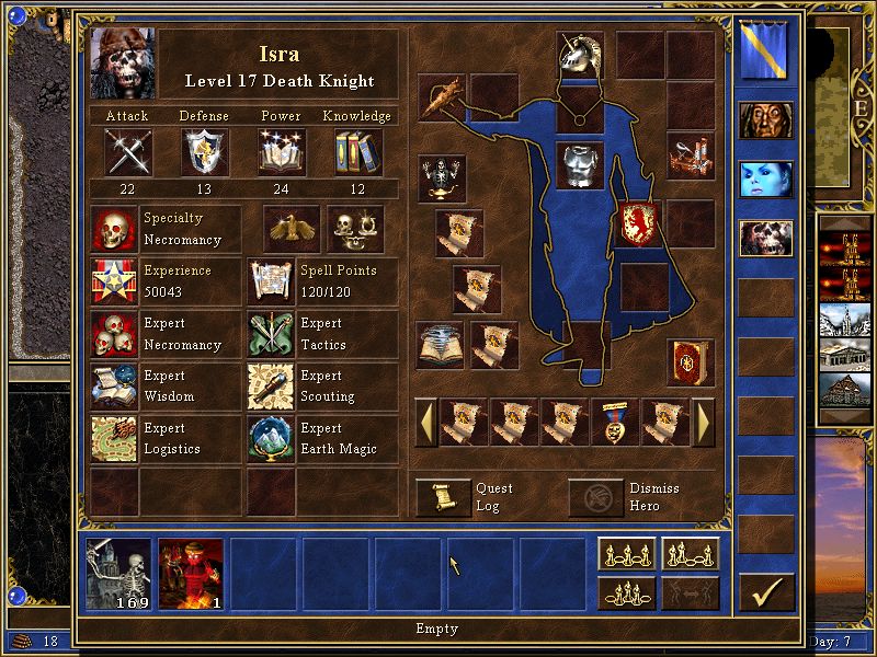 nechcel som si pokazit vztahy,, kazdopadne moj pohlad na hru(jedna z naj ake som hral) alex mal v druhom tyzdni staty okolo 10 vsetky(v daka stitu +4 myslim), ja dva pekla, v 4 som zobral kartac, ostal v nom stat, par poli odomna bola kniha vzduchu-- tu vzal alex a siel na druhu stranu,, staty mal o dost vyssie odomna tak som sa vybral po jedinu dracarnu-- v tom ma alex odrezal... dracarna bola z tych najtazsich- ale dostal som mec 12att -3 def a helmz +6all-- potom som mu vzal jeho hrady,, vo vezi dostaval vezu kde som dostal na 4lvl tp,, ale mag zeme dostal nanestasie aj alex,, vsetko vyzeralo hrozivo jeho kostry a vsetko,, ja s 5x mensou arrmy,, ale utok 36 proti jeho(uz nvm kolko, kedze som vacsinou nemal 2 putyky:D:D) spravil v boji az prilis tesny vysledok,,v daka athilerii a antimagicu by som sa v hrade dokazal branit do nekonecna,,(s 8 knight ridermi a nejakej omacke som sa ubranil proti 2 devilom 2 anielomm 200 kostram 12 upg efretom,12 wywernam 5 kost drakom aa vampirom... alex to uz ratal za zdrzovanie,, ale keby sa mi v 2vezi objavil blind,, tak sa v hrade da zahrat boj tak, ze mu jedneho blinknem, a nechal by som si ho nakoniec, a teoreticky mu vzal aj hera(to bola fakt posl sanca na vyhru),, veza bola prazdna a to je koniec,, skoda ze to berie ako zdrzovanie... kniha vzduchu o den skor to vyhrala,, ale krasna hra