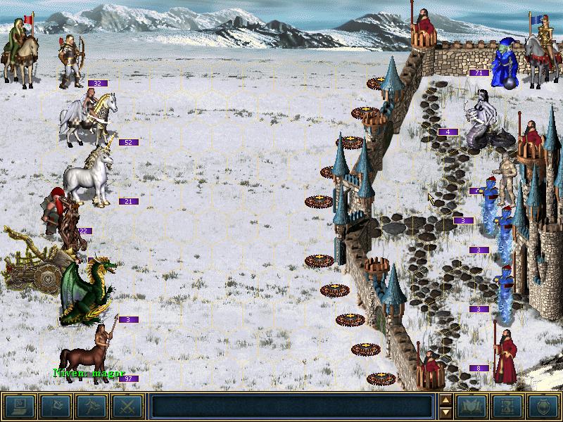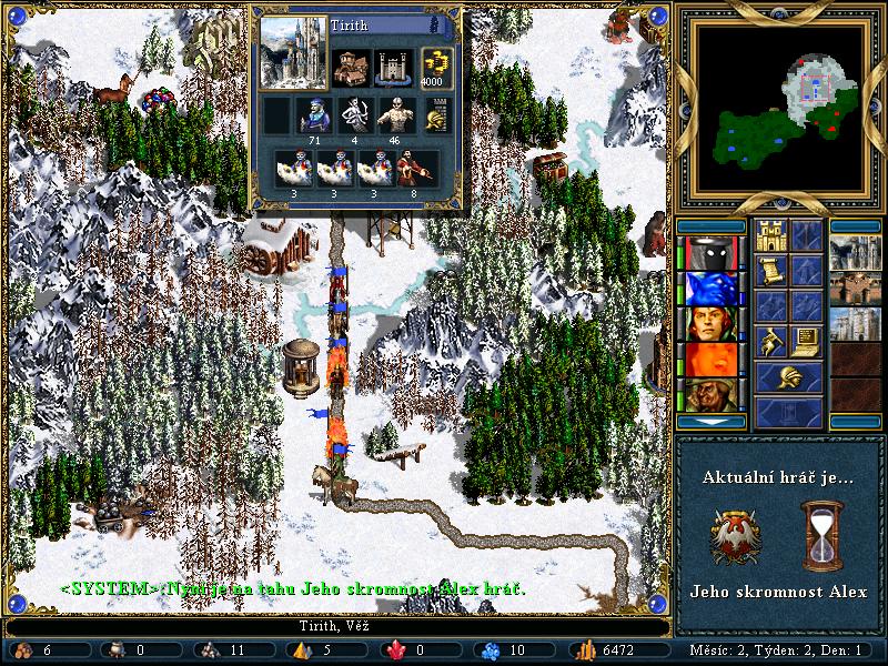 No řekneme to asi tak. 1. týden jsem zjistil, že jsme den cesty od sebe. Tak jsem chvátal udělat co se dá. Nekoupil jsem ani mágy, ale zlata bylo hafo. 2. týden se objevil modrák a byla naděje něco udělat. Jeho jsem koupil a pokoušel mu s ním dobýt hrad, ale prcalíci jsou svině. Mezitím jsem hledal dřevo. To bylo 4 dny cesty od hradu úplně debilně. A já jel hledat na trávu, tam jsem vzal další 2 hrady, ale dřevo nikde. Nakonec jsem ho našel 3. týden 5. den. Takže jsem koupil mágy a nagy. Potom jsem ho nadále otravoval solmyrem, ale Alex už se chystal na mě. Tak jsem musel domů a Monerem s vílama dobýval další věci. Bohužel arma extru na pegasy, prcalíky a ve vsi prcalíci a kentauři. To už nešlo přebít. Ztráta 2 týdnů se nedala přebít.